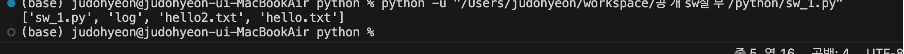 os모듈에서 제공하는 listdir 함수는 지정한 디렉터리의 모든 파일과 디렉터리를 리스트 형태로 return한다. 따라서 path를 인자로 받는다. 그래서 위 코드에서는 path값에 현재 디렉터리를 의미하는 '.'을 저장했다. 이후 리스트를 print한 값이다. 해당 디렉터리에는 위에서 실행한 예제들이 저장되어 있다.
