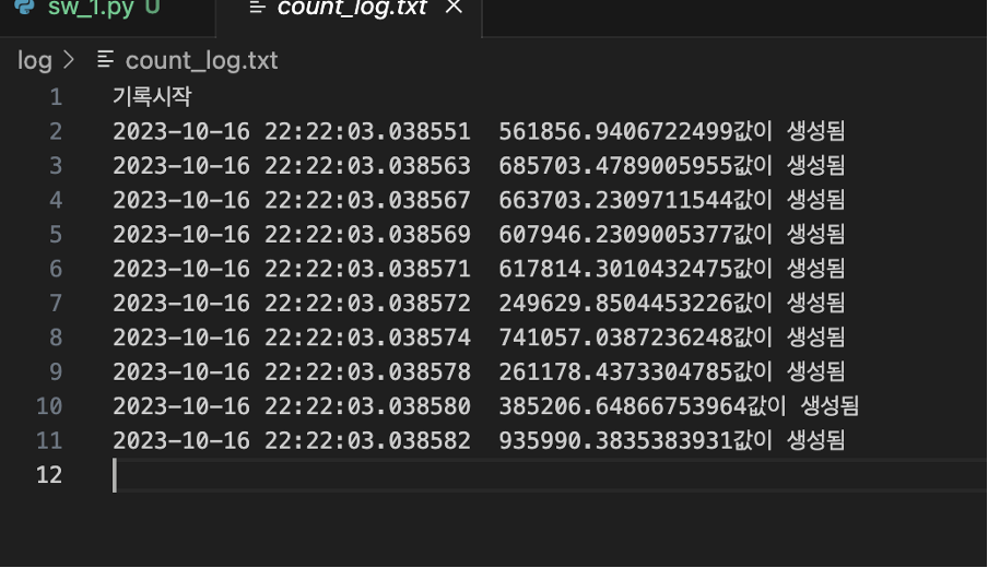 따라서 해당 파일을 추가 모드로 열고 10번 반복하는 반복문에서 각 반복문에서의 시간과 랜덤값을 얻은 것을 합한 문장을 파일에 추가한다.