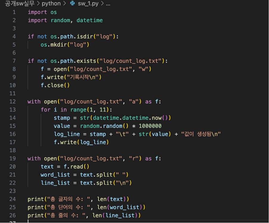 두번째 if문에서는 해당 경로 안에 다음과 같은 이름의 파일이 있는지 확인한다. 만약 해당 파일이 있다면 true값을 반환한다. 따라서 해당 if문에는 not이 포함되므로 파일이 없는 경우 쓰기모드로 파일을 생성합니다. 이후 "기록시작\n"이라는 문장을 추가한다. 이후 열린 파일을 닫는다.