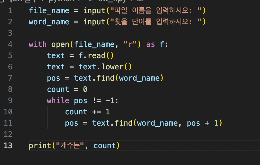 파일의 이름과 찾을 문자를 입력받는다. 이후 with as 블럭에서 file_name에 해당하는 문서를 열어서 읽어서 text에 저장하고 모두 소문자로 바꾸어 준다. 이후 find함수를 사용한다.